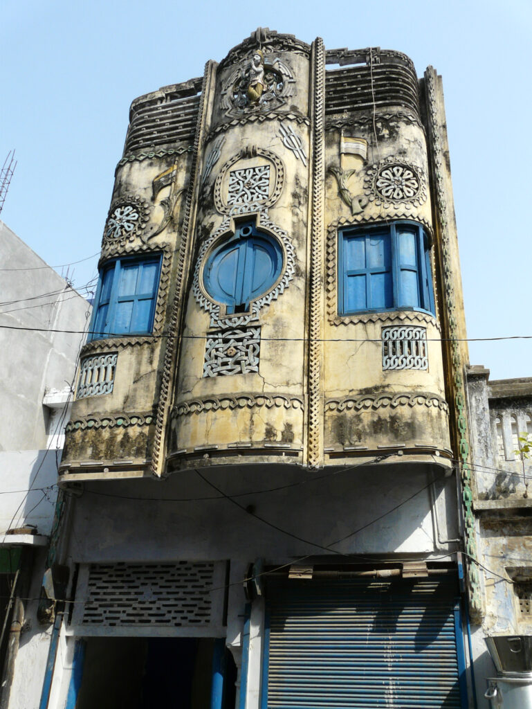 Streetscapes of residential and retail areas began to be characterised by distinctive geometries and syncretic architectural features. Numerous commercial buildings in towns like Nanpara, Uttar Pradesh, combined aesthetics from Indo-Saracenic and Art Deco architecture. These ‘deco-esque’ inspirations were further distinguished by the use of trellis patterns, bas relief elements and streamlined forms. The confluence of Art Deco with traditionally Indian sensibilities can also be seen in the Indo-European aesthetics of the havelis in Sidhpur, merging influences from Art Deco, Baroque, renaissance, and neo-classical architectural styles. This brought about a visual jumble of gabled roofs, terrazzo floors, and ornate jharokas that served as status symbols representative of the influence and prosperity of the Dawoodi Bohra community.