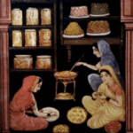 Attributed to Keshav Das and Mah Muhammed, “The Spy Zambur Brings Mahiya to the City of Tawariq” depicts two spies, Mahiya and Zambur, who enter the city of Tawariq riding donkeys laden with fruits. They are in search of Hamza’s son, Prince Ibrahim’s kidnapped lover, Khwarmah. Traversing through a dusty lane, they fortuitously encounter another couple, a medicine woman Ustad Khatun and her husband. Mahiya turns her gaze to Zambur, gesturing towards Khatun, who according to the accompanying text, would provide them with a safe house and cover.