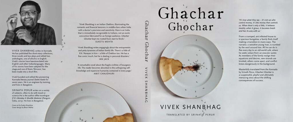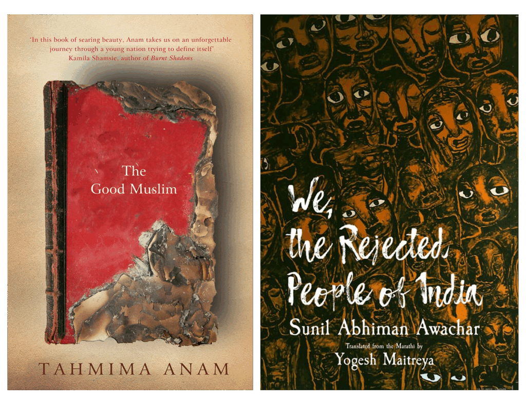 But minimalism can also create unease rather than erasure. Bhavi Mehta’s cover for Ghachar Ghochar (2015) is a study in this tension: an immaculate white background, a perfectly centred plate, and crisp typography — into which creeps a coffee stain pooling like a bruise, a scatter of ants breaking the sterile surface. It is minimalism made unsettling, an echo of the novel’s quiet domestic claustrophobia. It uses Western design language to illustrate the core idea of a very Indian tale. Similarly, the cover of The Good Muslim (2011) uses a burnt red book as its central image, its charred edges exposing layers of text. Paired with restrained typography, it speaks through absence, turning the damaged object into a witness. The design carries political weight without ornamentation, making it both stark and memorable.