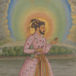 In this miniature painting, Krishna and his consort descend from the skies on Garuda, his bird-like mount, to visit the palace of the demon Narakasura, the mythical asura king of Pragjyotisha (believed to be modern-day Assam) amidst great ceremony.